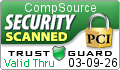 PCI Scanning Status: Passed Disclaimer: This certificate confirms that compsource.com has been tested for external server and security weaknesses by an Approved Scanning Vendor, and that no significant vulnerabilities were found as of the last successful scan date. While reasonable efforts are made to assure the scanning service is functioning properly, Trust Guard makes no warranty or claim of any kind, regarding the information or service provided. In addition, Trust Guard does not guarantee that the site is immune to hackers or that any data stored on the site is safe, and Trust Guard is in no way responsible for the security of or use of any of the information stored on a scanned site. Security Verified : In order for compsource.com to qualify for the Trust Guard Security Verified Seal, we verify that their website is using at least 128-Bit SSL Encryption on pages where private information can be entered, such as credit cards, Social Security numbers, loan information, etc. and we monitor the SSL certificates expiration.